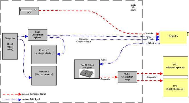 Now, we can see what the projector is showing from the A/V room - this is not significantly different than before, but it's a building block for the next steps. There's still the issue of no input source flexibility. Let's run an additional RGB cable to the projector, in case we want to be able to add a notebook computer (for those unusual events when someone brings their own Powerpoint slide show).