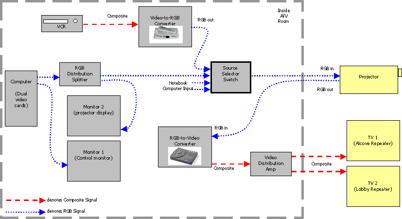 ![]() Setting up a Dual-Monitor Projection SystemPart II - Projector Wiring SetupsIf your church has decided to install a digital projection system, and you'd like to save a considerable amount of money by doing the installation yourself, you might be wondering how to set up the system. There are many possible ways to wire a system, and each has some benefits and some problems.This page is a primer on a number of possible setups, with illustrations and a brief discussion of the merits of each. The "complete" option may look complicated, but you can purchase ALL the equipment shown here, including the PC, a very good projector (XGA resolution, 2500+ lumen), the cables, monitors, and conversion boxes, for well under $10,000. And the wiring is not very complicated. You don't need to pay a contractor $35,000 to do the work for you. And if you decide you'd rather that it be installed professionally, this at least should help you evaluate their proposal more intelligently.