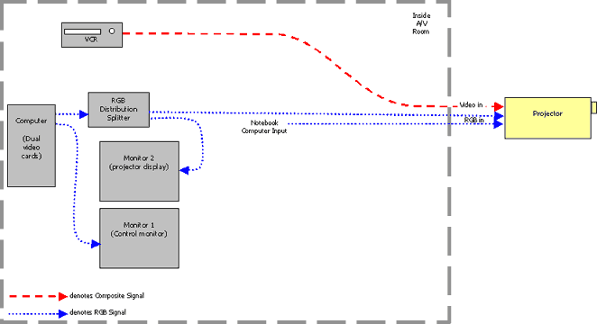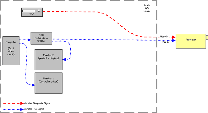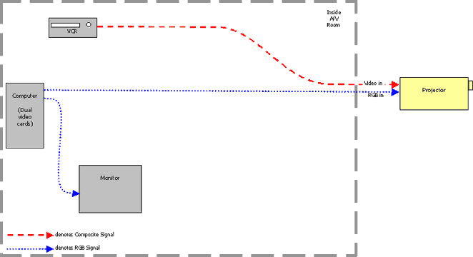 This system is the most basic possible projector setup. The PC has one video card, there's one monitor, one projector, and a VCR (all these examples will include a VCR). The projector handles all the source switching. Benefits: Problems: