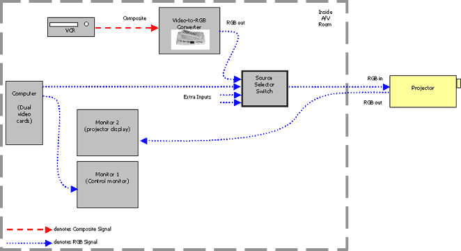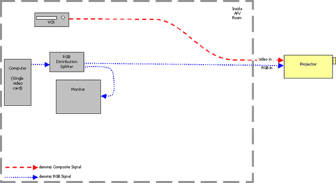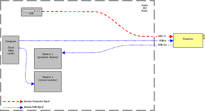 This system is the most basic possible projector setup. The PC has one video card, there's one monitor, one projector, and a VCR (all these examples will include a VCR). The projector handles all the source switching. Benefits: Problems: